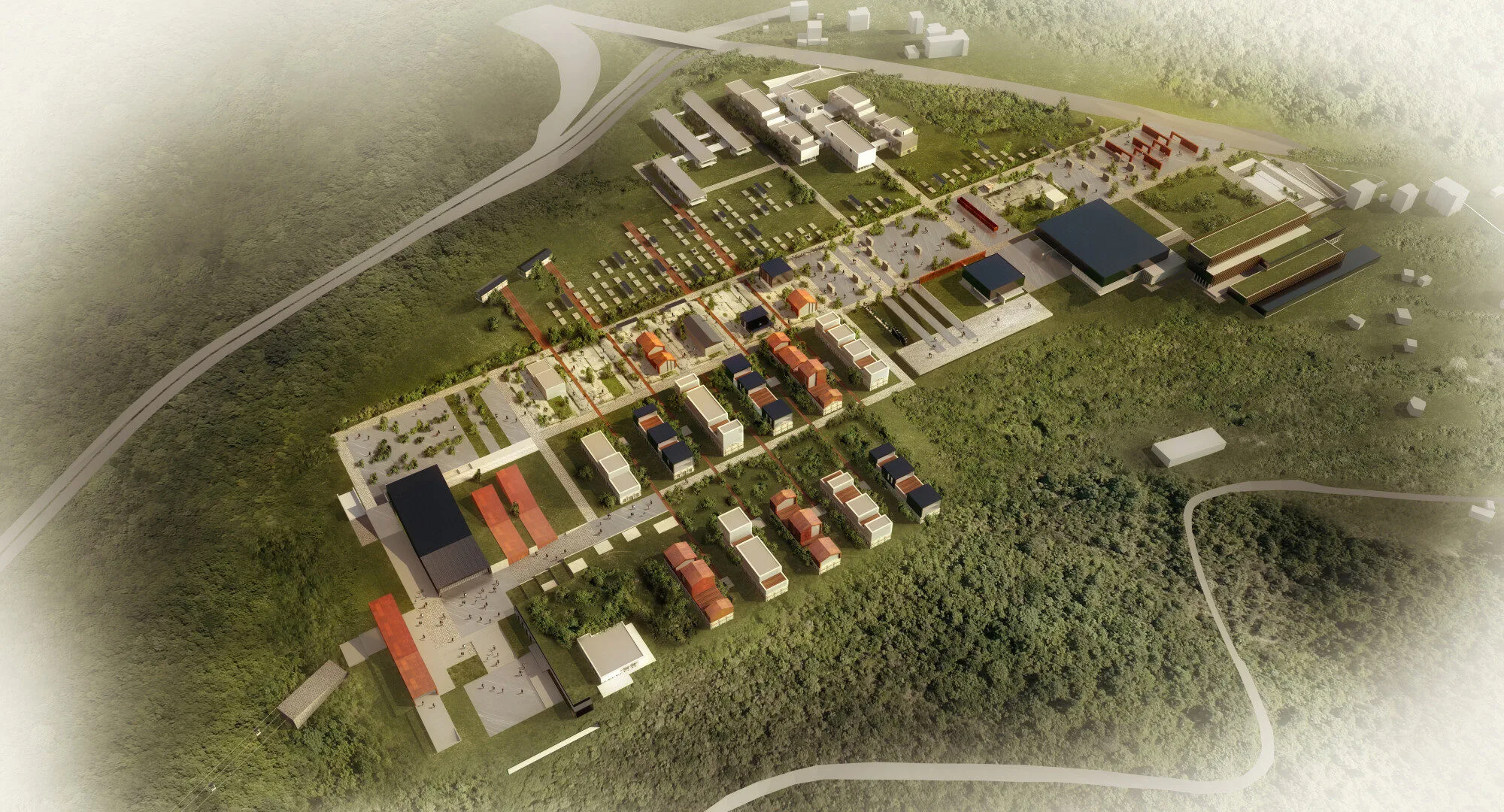 The design generates various orbits based on the scale of the functions and their impact on the surrounding area. These orbits create transitions between the different functions, facilitating their interaction within the broader urban context.