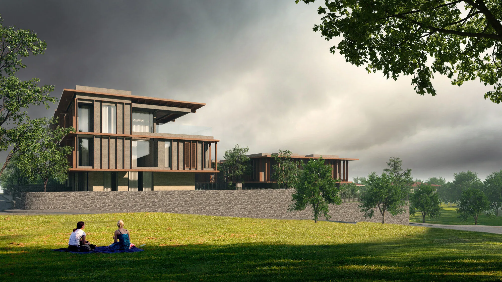 The landscaping is diversified to support different scenarios of garden usage, and privacy is maintained for outdoor amenities like the pool. The terracing continues across the entire site, with each individual unit featuring three garden areas: one on the lower level in front, one on the upper level in front, and one on the upper level at the rear. Each unit is configured to include at least four bedrooms, with terraces designed to support outdoor activities. At the same time, precautions have been taken to address challenging structural conditions. In this context, materials and construction details that align with the Eastern Black Sea architectural tradition have been employed, paying homage to traditional styles with a modern approach.
