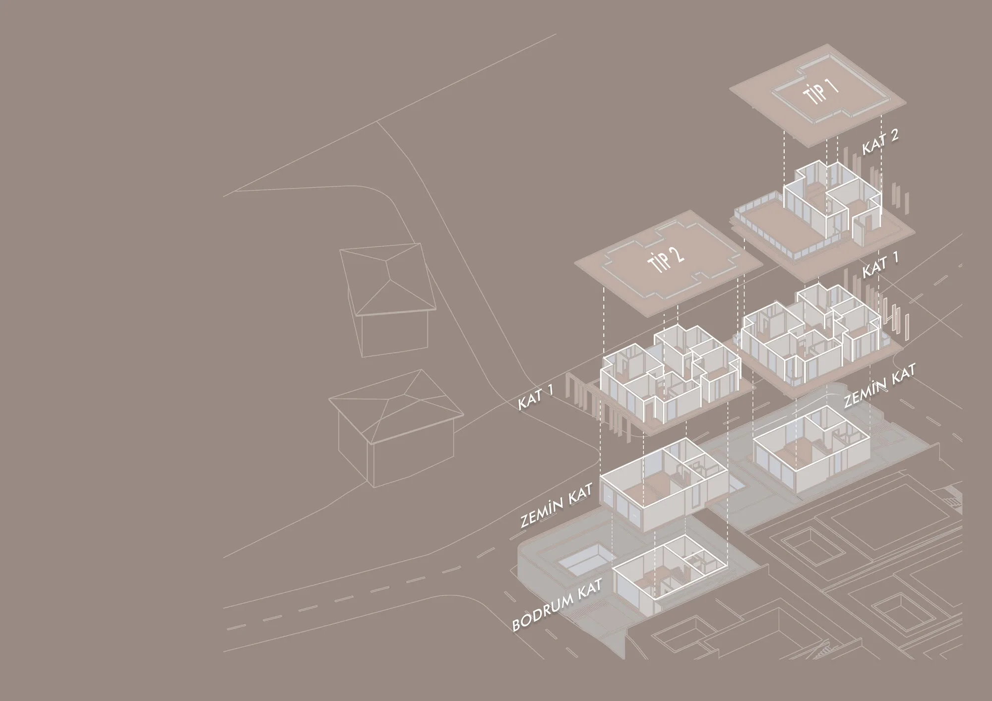 The design area is situated on an elevated parcel surrounded by hazelnut orchards, yet it offers expansive sea views from its dominant facade. Although the slope is not too challenging, it allows for terracing, enriching the architectural scheme. The plan to accommodate eight individual housing units, agreed upon by the landowner and investors, is comfortably achieved with adequate spacing between blocks.