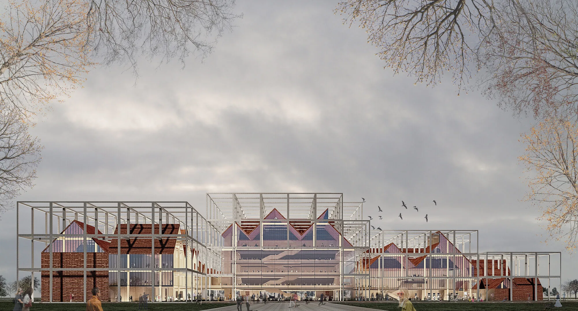 The sloping roofs, featuring a variety of forms, draw inspiration from the Gothic architecture prevalent in the city. These inclined rooflines are repeated to better integrate the large mass of the building into its context and to break down its perceived scale. The design seeks to offer a contemporary interpretation of Gothic architecture by blending roof and wall elements, creating a cohesive expression between the exterior facade and the roof structure.