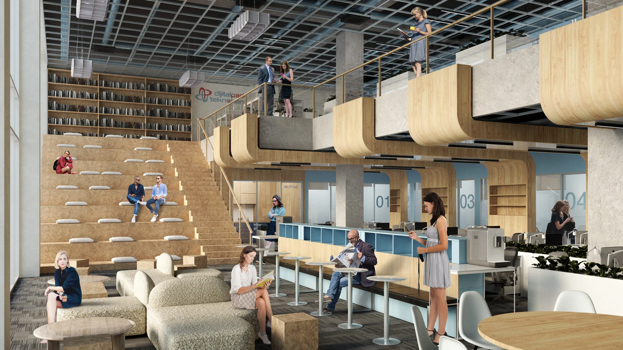 The interior design language aligns with the graphic identity of Dijitalpark Teknokent, featuring refined solutions that evoke a sense of openness and calm through natural material compositions. This approach, while maintaining its distinct character, allows users to remain connected to their environment without feeling detached, fostering sustained engagement with the space.