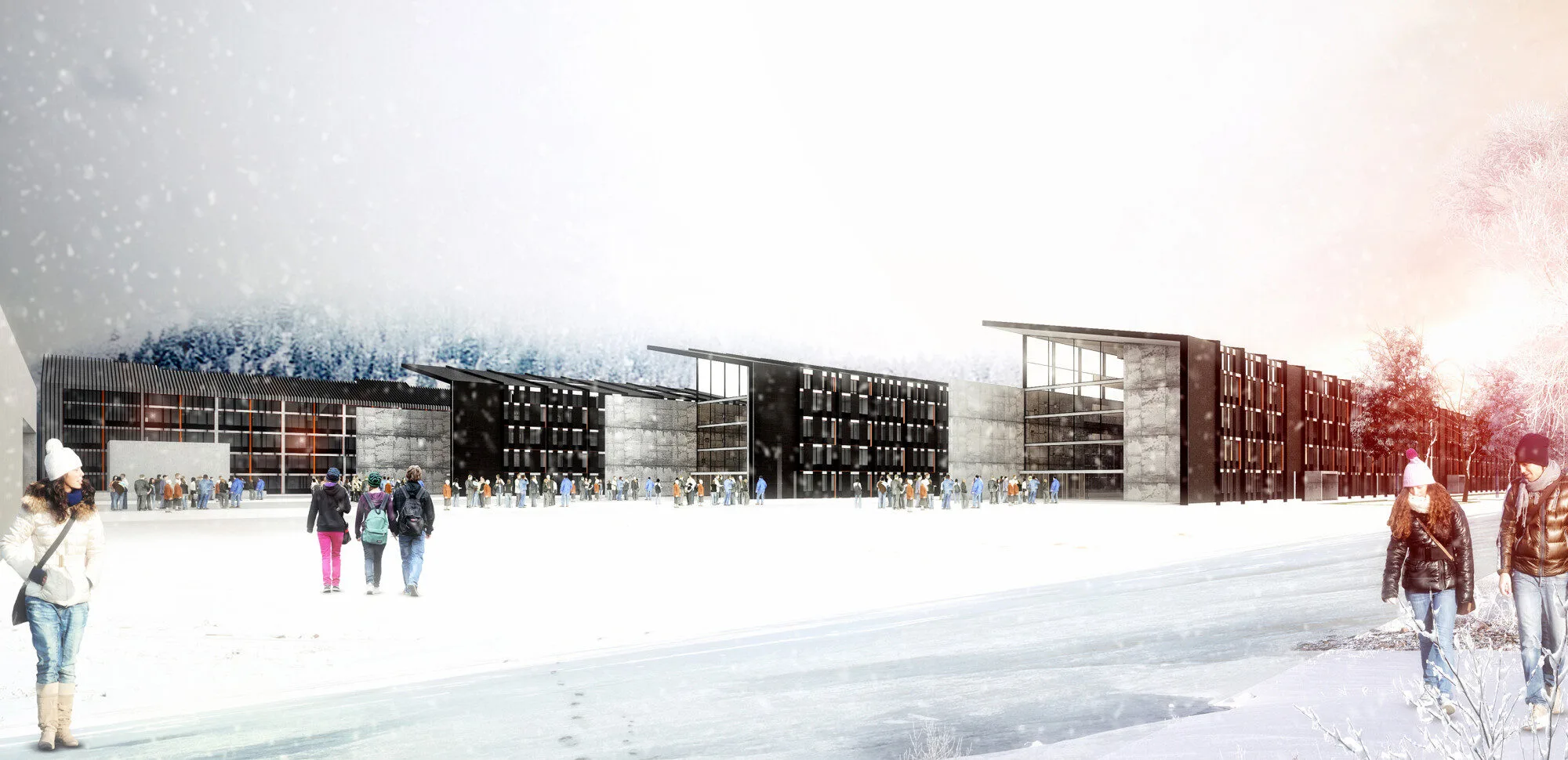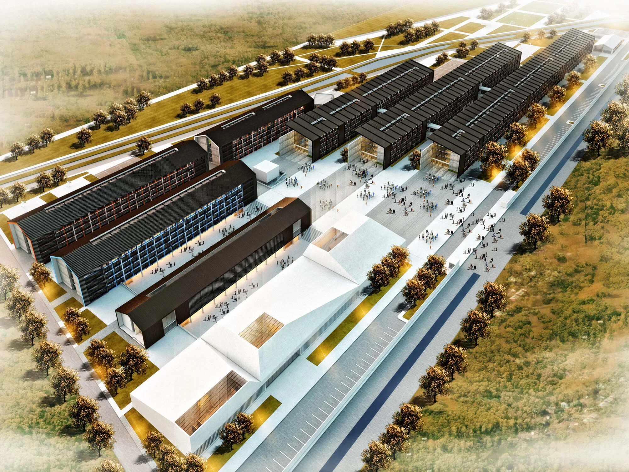 Central to the campus is a main square that facilitates both visual and functional connections among various units while allowing for programmatic separation. This approach accommodates the natural topography and enhances the user experience for approximately 10,000 daily students.
