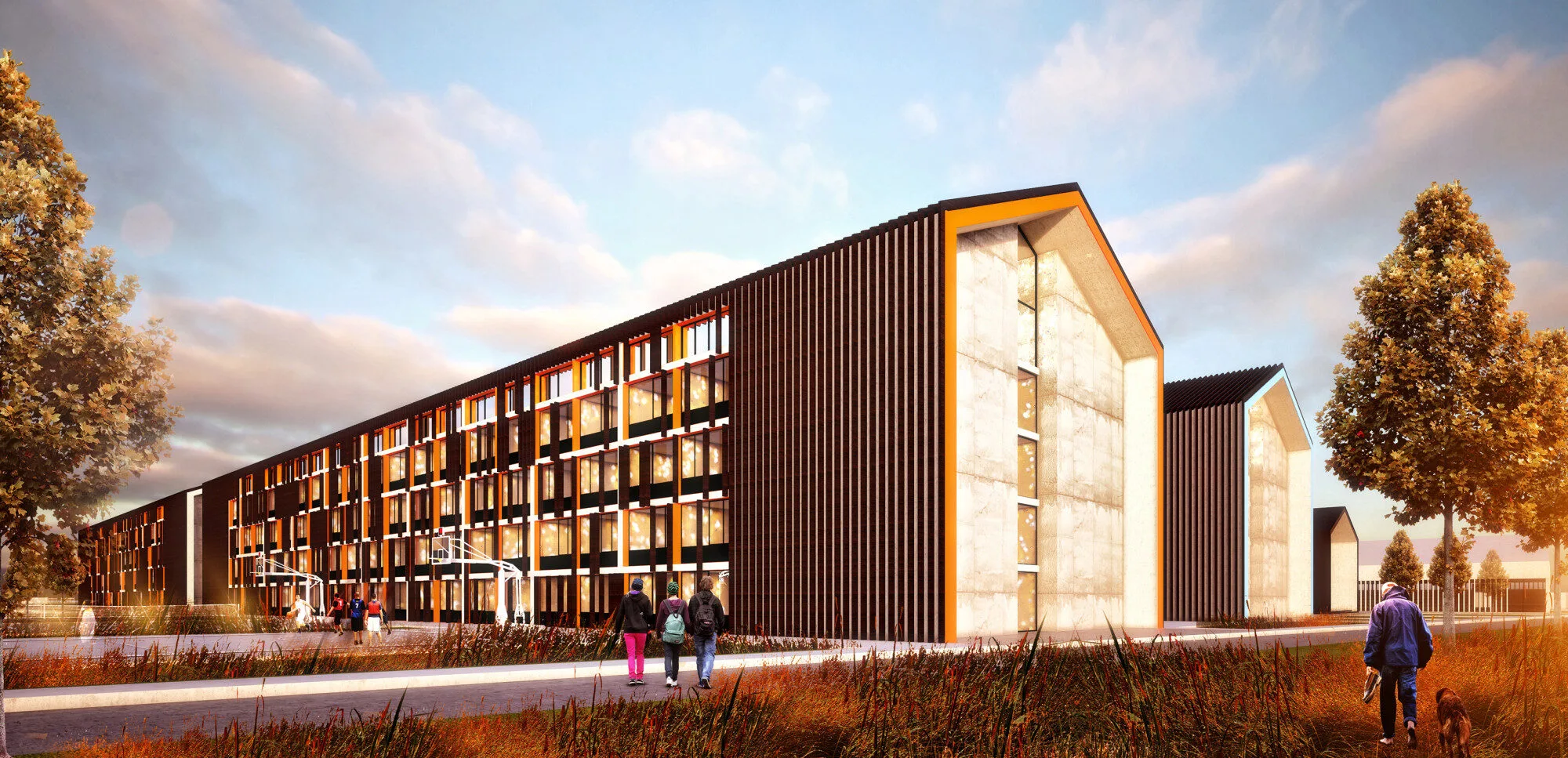 The campus design prioritizes climate responsiveness, employing suitable roofing and spatial orientation to mitigate external weather effects. Green elements are strategically incorporated to support ecological sustainability, while social spaces are integrated to foster continuous activity throughout the day.