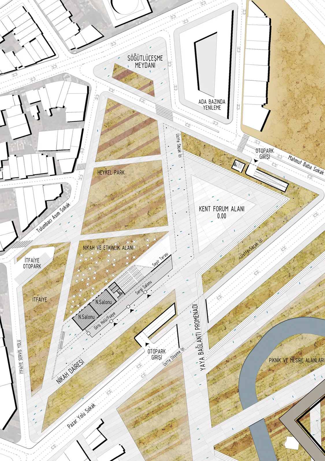 Zone 2: The marriage office is reorganized with a city forum, fire station, and underground parking, stimulating regional transformation. Open space needs are met with Söğütlüçeşme Square, while a forum encourages social interaction. Continuous pedestrian promenades connect key areas, preserving vital green spaces.