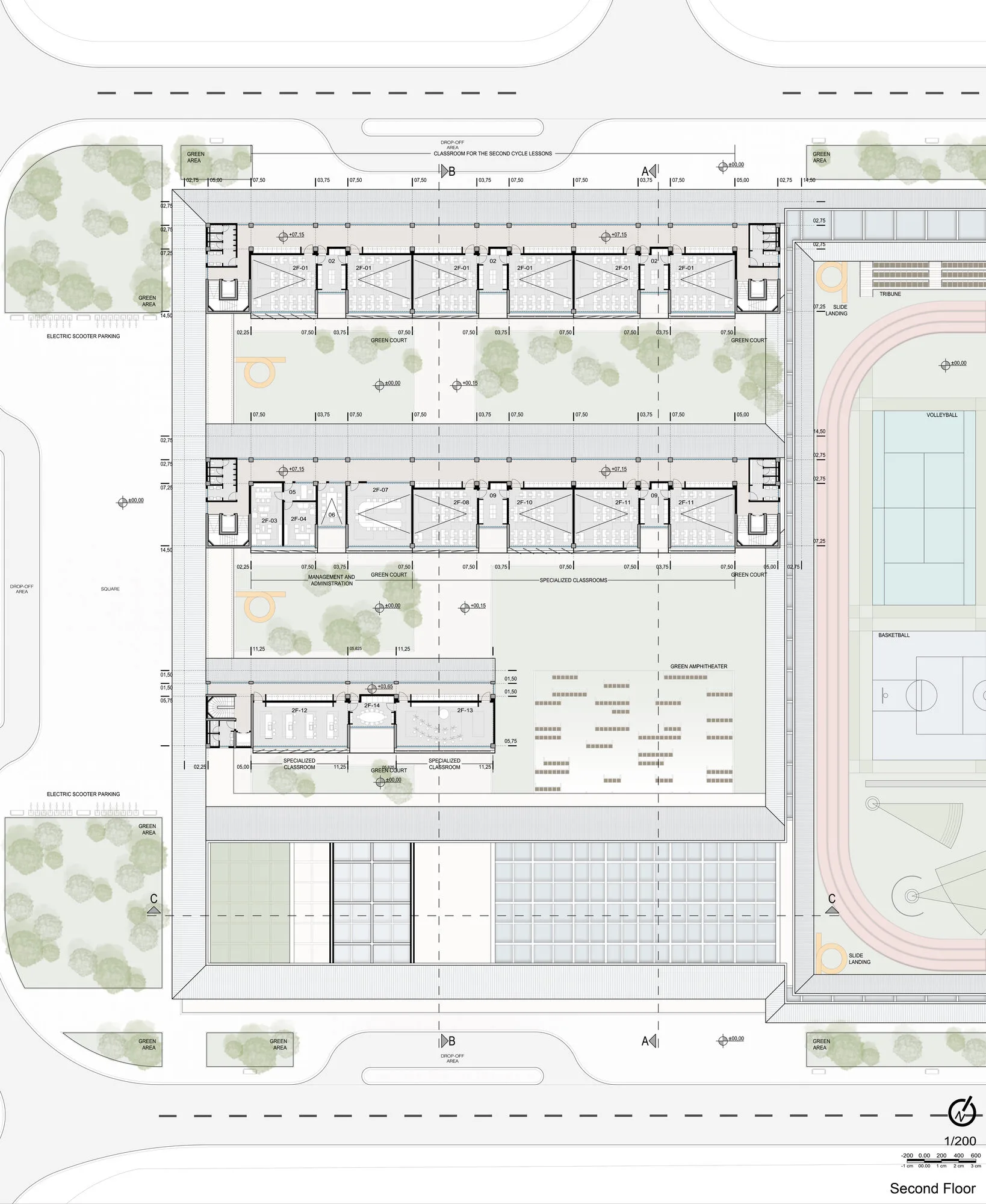 Consisting of a running track consisting of four lower rows, a jumping track, shot put fields, two volleyball courts and a basketball court, the “Sports and Playground” is shaped with intertwined track arrangements in order to bring all these components together with minimal space consumption. Accordingly, a semi-Olympic running track defines a cycle to cover all the remaining fields. This loop positions the subcomponents in a north - south orientation to prevent players from being affected by the sun during the broad day. As mentioned before, in the macro form where the linear education blocks / structures integrate with their short sides, all the inner gardens are integrated with the main courtyard in a similar manner. The same attitude repeats itself in an upper floor plan. Likewise, the open / semi-open bridge structure that surrounds the education blocks from the right and left in the 1st floor plan, this time emphasizes the “Sports and Game Courtyard” by turning it around. Thus, the building architecture is shaped under a "Macro Form" / "Macro Roof" that can be perceived holistically in terms of general approach. In order to encourage participation and increase the number of spectators, a comprehensive tribune is added to the northwest of the courtyard.