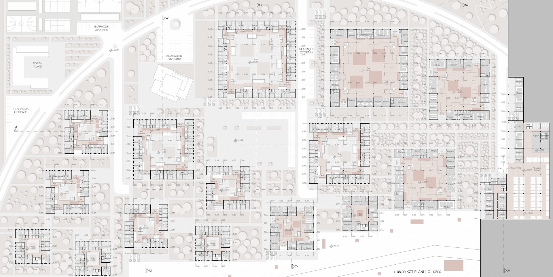 The central square has been designed as an open space. Light structural shading elements have been placed in this open area, with kiosks serving the square and surrounding areas. These structures are not directly tied to the building or the open space, but they significantly contribute to the use of shaded areas. These shading elements connect the blocks through semi-open structures, diversifying access routes to the square. They extend to the blocks' courtyards, enabling uninterrupted daily activities. As a result, the commercial spaces and facilities located on the ground level can remain active throughout the day.