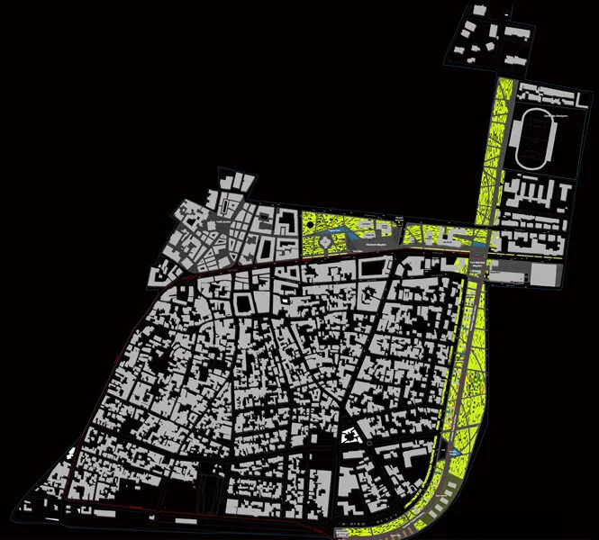 In light of this, the project reconsiders existing pedestrian sidewalk dimensions and parcel boundaries to create a pedestrian promenade that abstracts from the current traffic flow, featuring green buffer zones and urban elements. This promenade is enriched with various urban units. Furthermore, considering the prevalent potential for bicycle use throughout the city, a bicycle network that extends along the pedestrian axis and connects to multiple points across the city has been proposed.