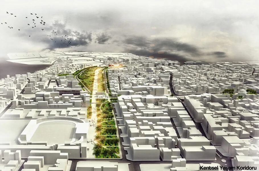 This area, characterized as the most significant urban void within Ödemiş, traverses the city along the north-south axis. Structurally examined, it represents a substantial opportunity for the region due to its dense green fabric. However, due to usage problems, this area, which should serve as a meeting and recreation point for people, has become a wall dividing the city. Within the project, this area is envisioned to play a key role in the future vision of the city. Reassessed urbanistically, this area has been transformed into an urban life corridor with tranquil green spaces, landscape elements, social amenities, sports and recreation areas, a sculpture park, and walking and cycling paths. Additionally, the existing railway line has been terminated at the beginning of this axis, and a proposal for a tram line encircling the city has been introduced, starting from an information center at this point.