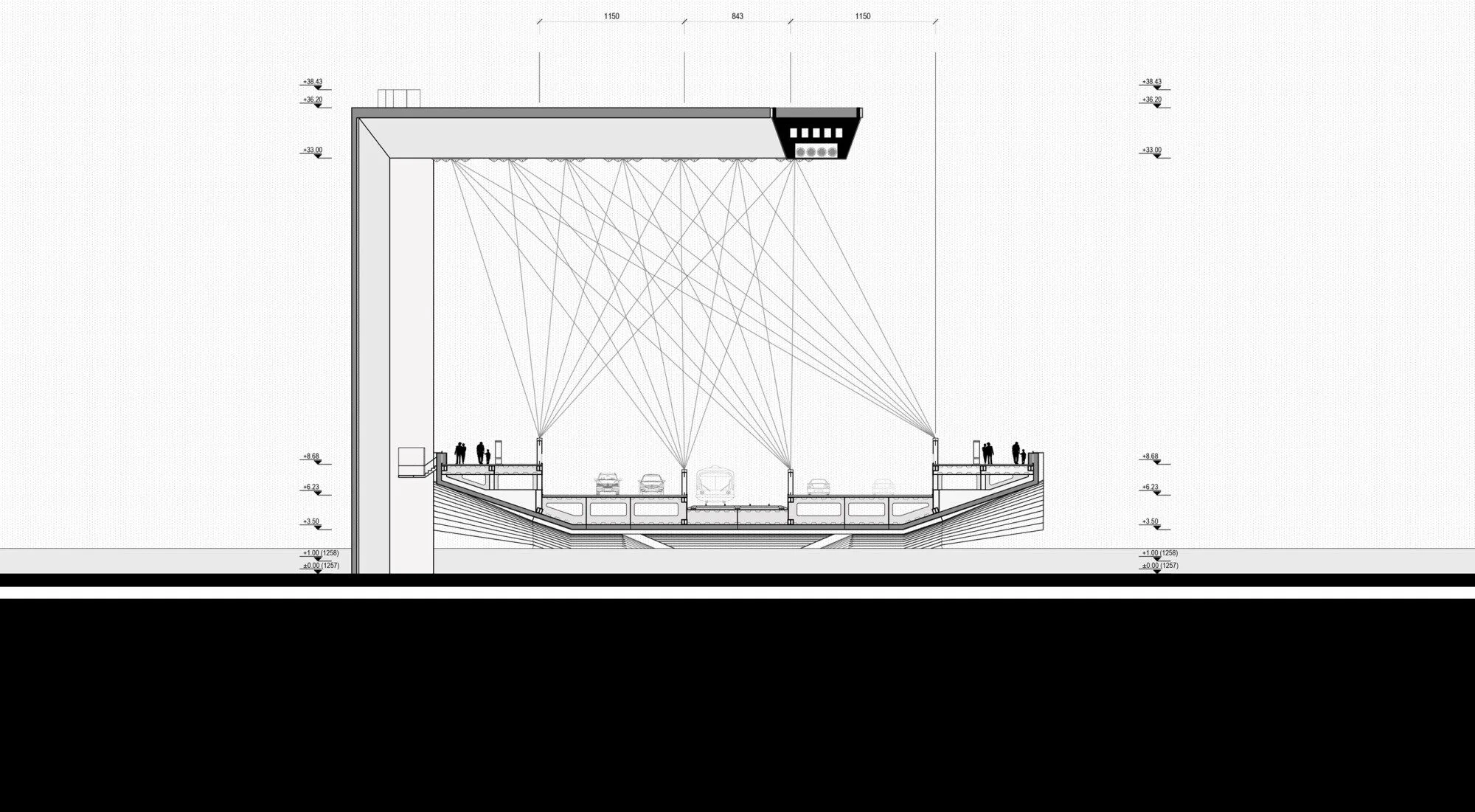 The inclination and variable angles of the suspension cables facilitate unobstructed passage for both wheeled vehicles and railway systems, as these transit types are segregated from pedestrian pathways, thus maintaining visual continuity. This spatial arrangement ensures that the pedestrian and cycling routes proceed uninterrupted, free from visual disruptions or the adverse impacts of vehicular traffic. The cantilever joint detail allows for the integration of wind corridors between the pedestrian and cycling paths and the main deck, providing structural resilience against potential resonances within the bridge structure.