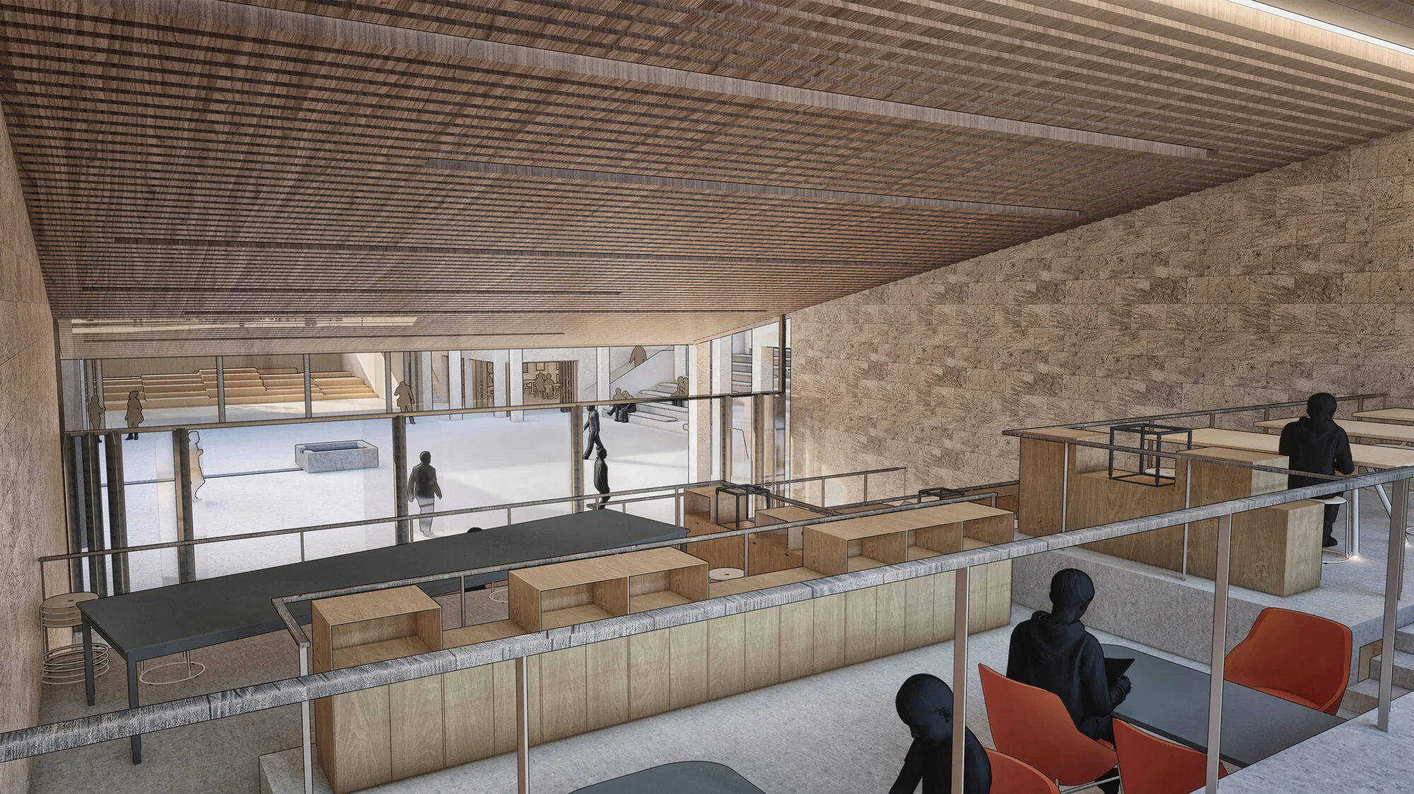 A multi-purpose hall has been integrated into the design, with adaptable seating that accommodates a variety of functions, from seminars to community events. A modular approach using hydraulic pistons enables the space to transform for different needs, such as meetings or memorial services.