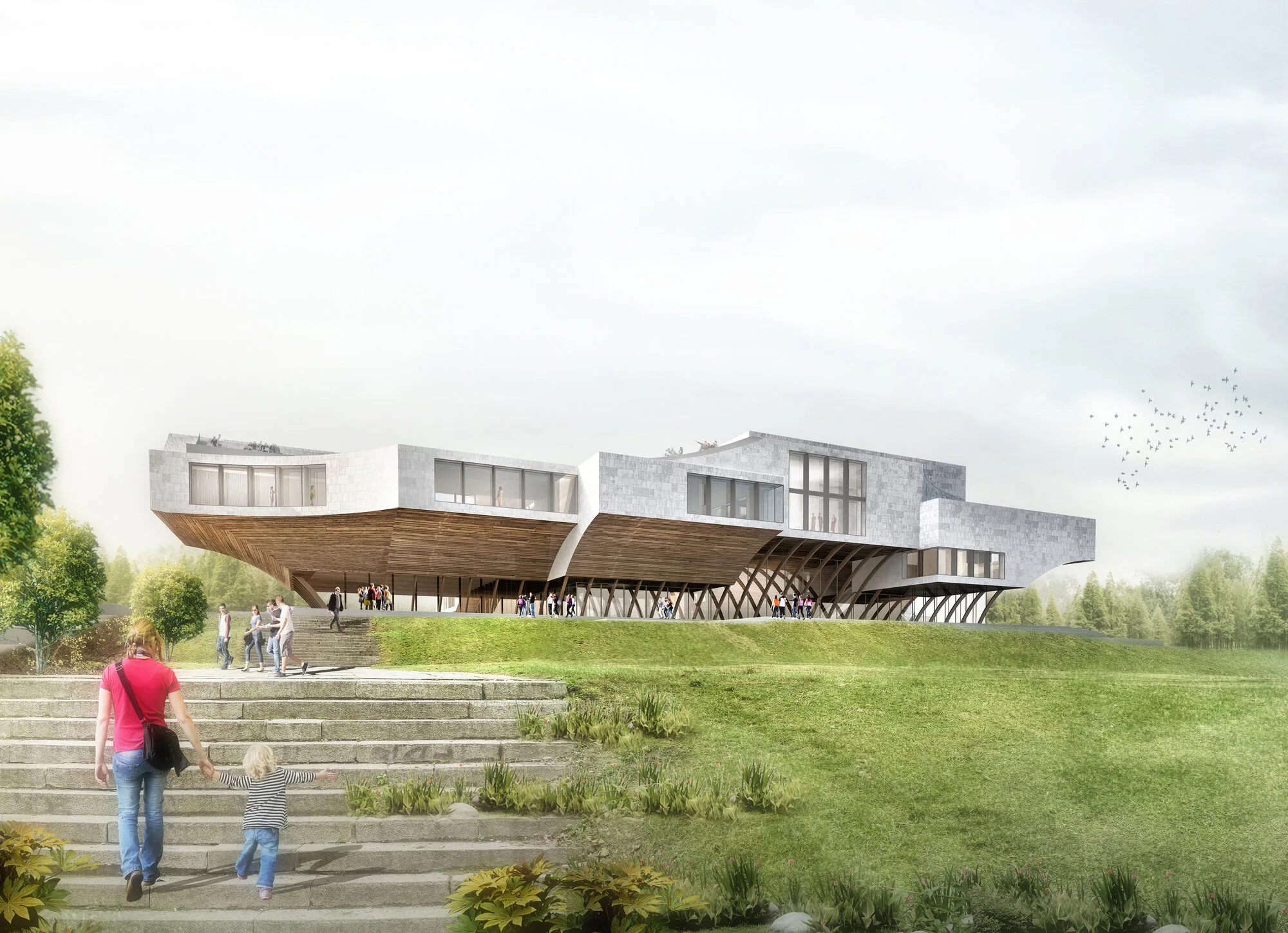 In recognition of Lithuania’s environmental heritage, the architectural form draws inspiration from both the country’s forests and its maritime traditions. The use of locally sourced timber as the primary structural material not only aligns with sustainable building practices but also acknowledges the importance of wood as a key element in Lithuania’s industrial and cultural identity. The structure’s form and materials echo the country’s shipbuilding legacy, with the use of techniques inspired by maritime architecture further strengthening the connection between the building and its natural context.